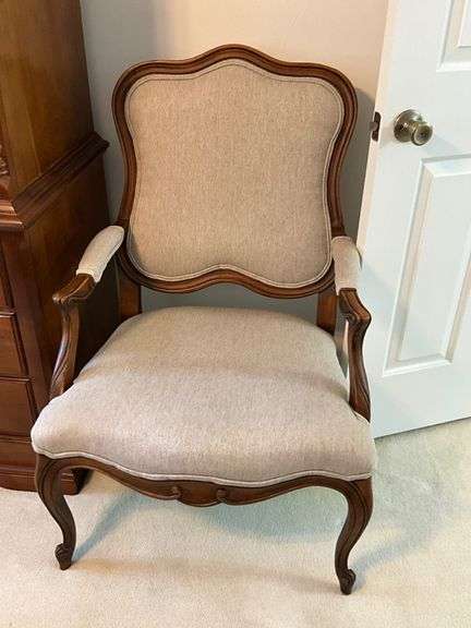 Ethan Allen armchair featuring a carved wood frame with an upholstered seat, armrests, and backrest. The beige fabric is tightly fitted and contrasts with the warm-toned, scrolled wood detailing on the chair's frame. The backrest showcases a gently curved silhouette, and the legs end in scrolled feet. The underside includes an Ethan Allen label. Minor signs of wear are visible, consistent with use.
