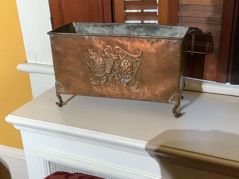 A rectangular copper planter featuring an embossed decorative design on the front, supported by raised feet with curved details. The piece also has side handles and a galvanized interior. Dimensions are 13 inches wide by 6 inches deep by 7 1/2 inches tall. Some wear is present consistent with age and material. Location: 1st Floor E