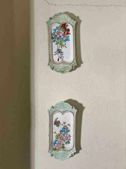 Pair of porcelain wall plaques featuring hand-painted floral designs with vibrant colors including pink, red, blue, and green tones. Each plaque includes ornate mint-green scrolled borders. Measuring 5" x 9", they exhibit visible crazing and minor imperfections consistent with age and use. Marked 'B.F.K.' on the back. Location: 1st Floor D