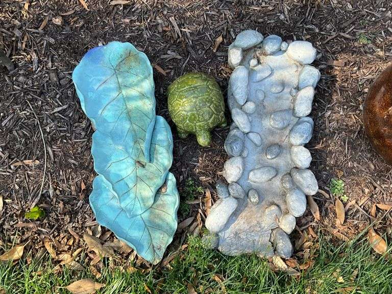 Set of three garden sculptures including a large turquoise leaf rain gutter tray, a green turtle, and a rectangular stone-effect pathway rain gutter tray. The leaf shows detailed veining, offering a naturalistic design. The turtle sculpture features a textured shell. The pathway piece has a carved stone design with a small visible crack and wear. Pieces show some weathering consistent with outdoor use. Location: BY