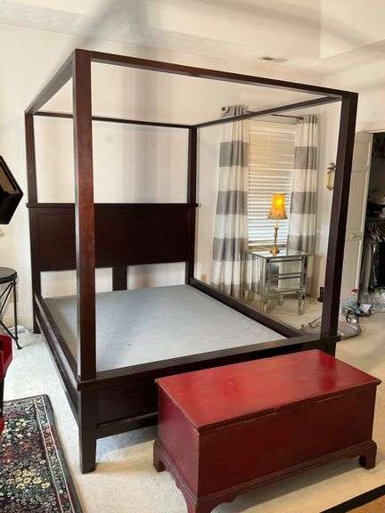 Queen size wooden canopy bed frame featuring a paneled headboard and frame structure for draping. Rich dark wood finish. Box spring not included, though available if desired. Buyer is responsible for disassembly and transport. Overall condition appears consistent with light household use. Location: 2nd Floor A