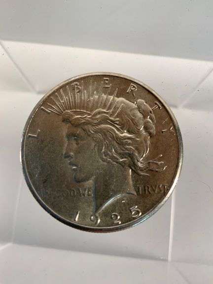1925 Peace dollar struck in 90% silver. Obverse features Liberty's profile surrounded by 'LIBERTY,' 'IN GOD WE TRUST,' and the year 1925. Reverse depicts an eagle perched on a rock with 'UNITED STATES OF AMERICA,' 'E PLURIBUS UNUM,' 'ONE DOLLAR,' and 'PEACE' inscribed. Displays wear consistent with age and circulation.