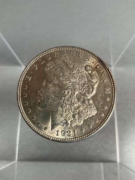 1921 Morgan Silver Dollar featuring the profile of Lady Liberty wearing a Phrygian cap adorned with wheat and cotton on the obverse and a heraldic eagle with outstretched wings clutching arrows and an olive branch on the reverse. Made of 90% silver and 10% copper.