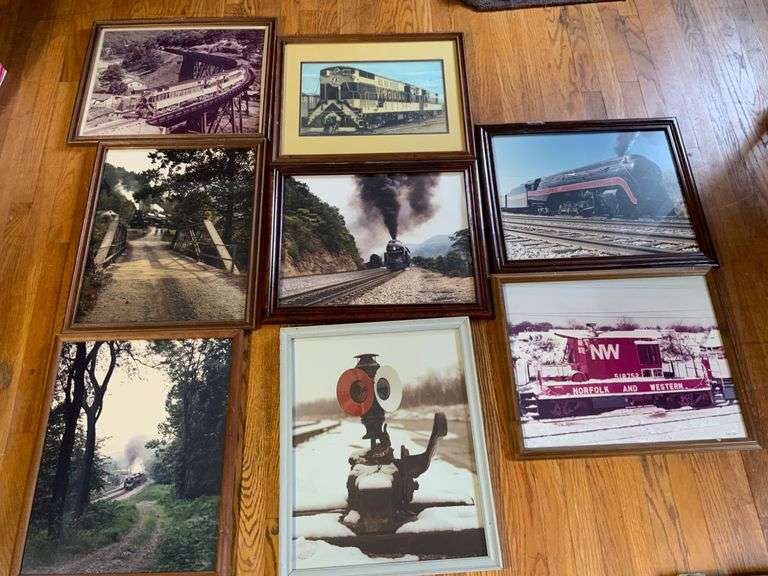Eight framed railroad photographs, some signed by photographer Steve Gibson. Images feature various trains, including Norfolk and Western locomotives, and railroad scenes. Frames measure approximately 18” x 22”. Wood and metal frame construction with glass coverings. Includes photographs showcasing railroads in diverse environments. Location: 2nd Floor A Bed
