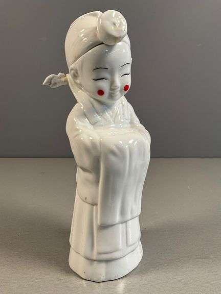 Porcelain figurine bottle by Bohai Brewery Co. Ltd. The item depicts a traditionally dressed figure with painted details such as red cheeks and eyes. The bottle is marked on the base with the company’s logo and name. Stands approximately 11 inches tall. Empty. Location: A