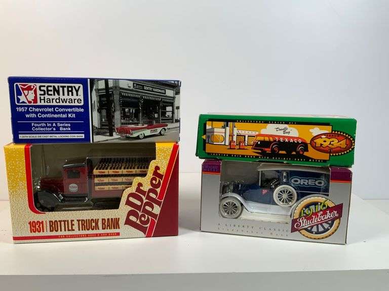 Four die-cast metal collectible banks, including a 1931 Dr Pepper Bottle Truck Bank, a 1916 Studebaker Oreo Delivery Truck, a 1957 Chevrolet Convertible Bank for Sentry Hardware, and a 1934 Texaco Doodle Bug Bank. Items are individually boxed, and each features painted details. Sentry Chevrolet is fourth in A series and Dr Pepper truck is 1:34 scale. Location: P