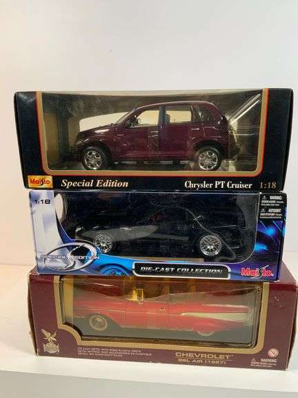 Two Maisto 1:18 scale die-cast model cars. Includes Chrysler PT Cruiser (Special Edition series, burgundy color with chrome accents), Specter Werkes Corvette Z06 (Die-Cast Collection series, black color with chrome wheels), and Road Legends Chevrolet Bel Air 1957 (red color with striped interior). Cars are housed in their original packaging. Location: P