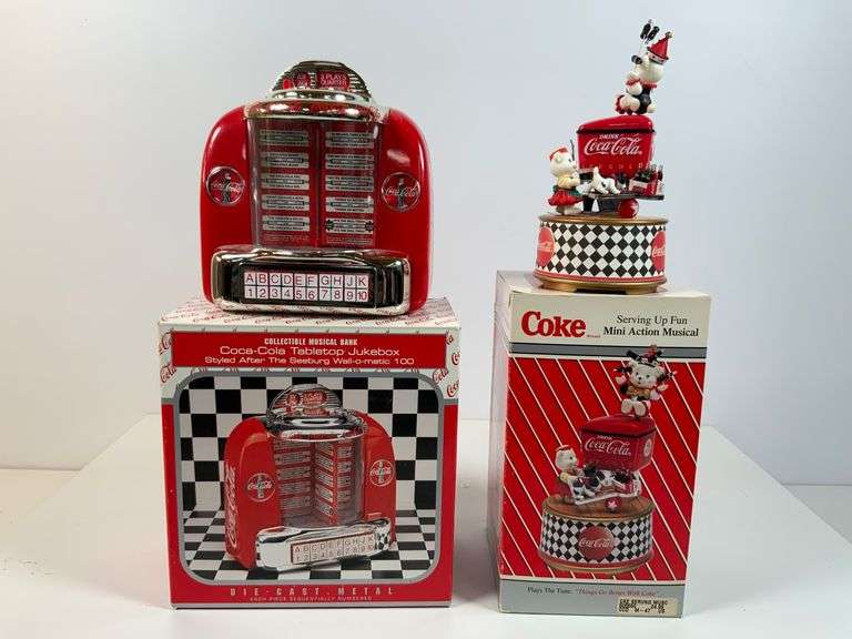Two Coca-Cola collectibles: a tabletop jukebox bank styled after the Seeburg Wall-o-Matic 100, made of die-cast metal and approximately 6.5 inches tall, and a 'Serving Up Fun' mini action musical featuring Coca-Cola branding with animated figures and a rotating base. Both items include their original boxes. Location: N