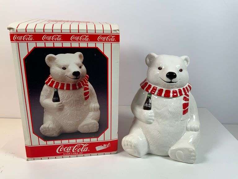 1994 Coca-Cola polar bear ceramic cookie jar featuring a white polar bear holding a Coca-Cola bottle and wearing a red and white striped scarf. The jar includes a removable lid and measures approximately 9.5 inches tall. Includes the original box with branding and product details. Location: N