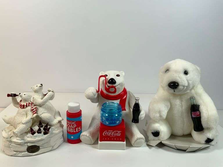 Three Coca-Cola-themed polar bear collectibles. The Heritage Collection musical bear figurine features two polar bears enjoying Coca-Cola with bottles scattered on a snowy base, marked with an authenticity plaque on the bottom. The Bubble Blowing Polar Bear ornament includes its original packaging, features a polar bear with a bubble jar, wand, and a Magic Soap Bubbles bottle. Lastly, a plush Coca-Cola polar bear seated, holding a small Coca-Cola bottle. Location: N