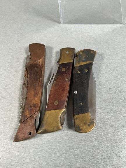 Three folding knives featuring various conditions. The first knife is marked 'Buck 112' with steel blade and brass bolsters. The second knife is marked 'Camillus, New York, USA' and includes an engraved signature on the stainless steel blade. The third knife has a heavily rusted and worn blade, with Valor marking. Knives feature wooden and brass handles. Location: L