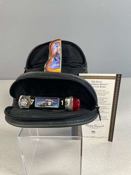 Elvis Presley-themed collectible knife in a guitar-shaped handle design featuring an image of Elvis and his signature. Includes a secondary blade engraved with '1971 Plymouth Fury' and graphics of a police car and badge on the handle. Comes with a zippered black carrying case marked 'Franklin Mint Collectors Knife' and a Certificate of Authenticity. Location: L