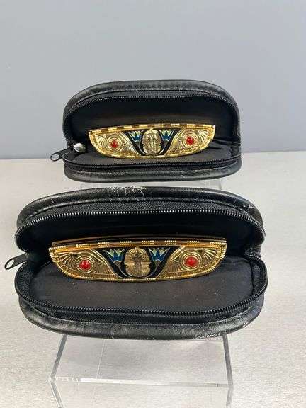 Franklin Mint collectors knives featuring gold-tone metal with red and blue decorative accents, including a design incorporating Egyptian motifs such as a scarab and hieroglyph-style patterns. Each knife includes a padded zippered case for storage and protection. Location: L