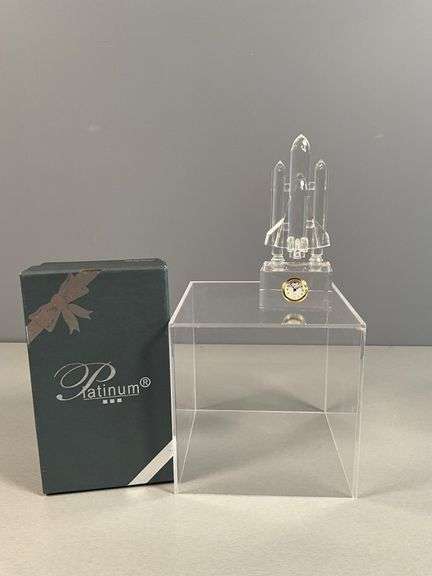 Crystal space shuttle figurine featuring an embedded clock with a gold-tone rim and white dial. Measures approximately 5.75” tall. Clock is untested and most likely needs a new battery. Includes original Platinum branded box. Model number C352 as labeled on the box. Location: L