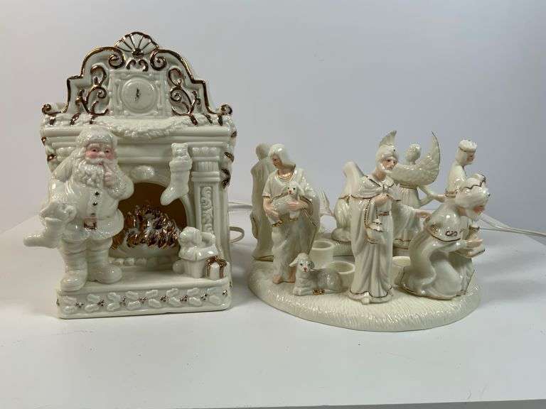 A ceramic lighted Santa by fireplace decoration, featuring gold-tone accents and Santa measuring 8.5 inches in height. Also included is a nativity scene candleholder, detailed with four candleholders and gold-tone accents. The Santa light cord requires replacement. Both items are presented in their original boxes from Dillard's. Location: Q
