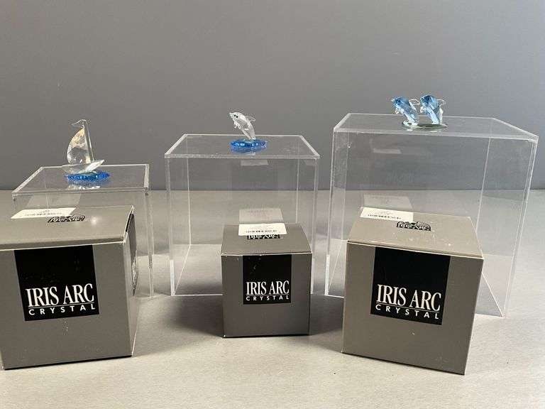 Three Iris Arc Crystal figurines, including a small sailboat on a blue base, a single dolphin on a blue wave, and a pair of blue dolphins on a mirror base. Each piece is crafted from quality crystal, showcasing intricate details. Includes original branded boxes with labels specifying 'Sailboat Small,' 'Dolphin Small,' and 'DBL Dolphin BLU.' Location: L