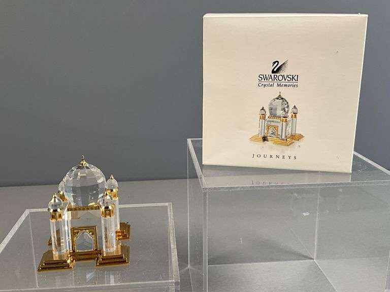 Swarovski crystal mosque figurine featuring a faceted crystal dome and columns with gold-tone metal accents. Includes the original box with the label. Made in Austria. Location: L