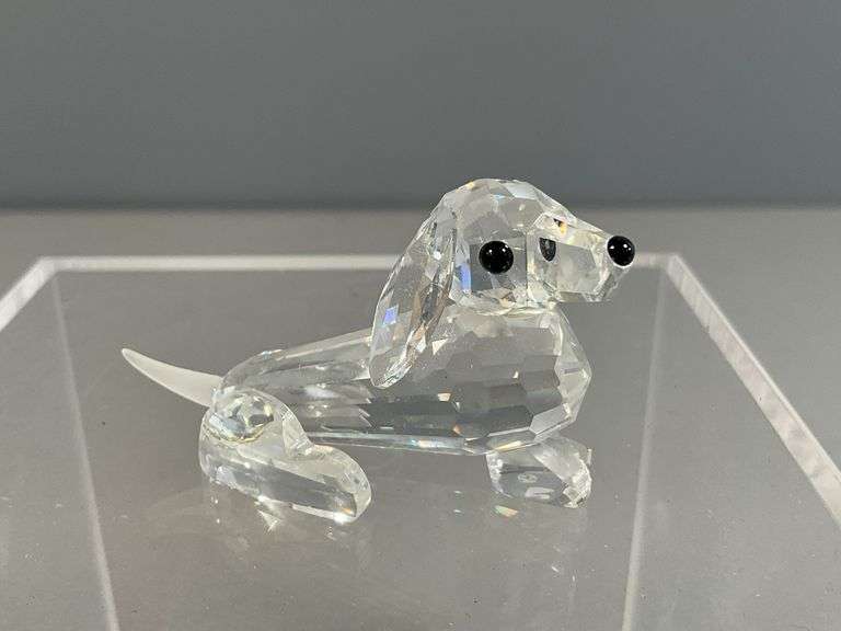 Swarovski crystal dachshund figurine featuring a clear faceted body with black crystal eyes and nose accents. The piece showcases intricate craftsmanship and clarity typically associated with Swarovski. Approximate height is 2 inches as shown. No box. Location: L