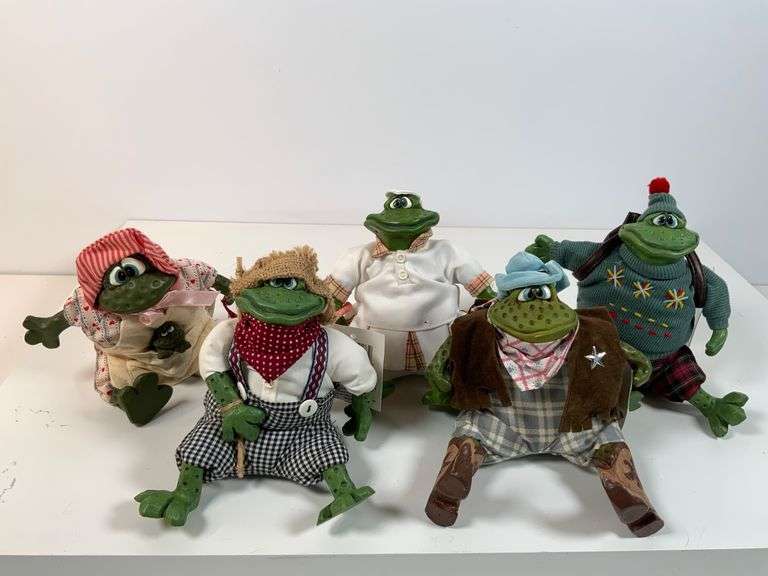 Five Russ The Country Folks frog figurines, handcrafted with detailed outfits. Includes characters such as Freida and Martina Hoppalova, as labeled on their tags. Each figure features unique costume designs including hats, plaid clothing, and accessories like suspenders and boots. Tags included, indicating care instructions and manufacturer details. Location: J