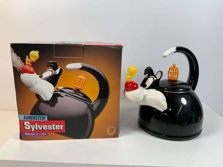 Kamenstein Sylvester 3-quart teakettle featuring a whimsical design with Sylvester the Cat and Tweety Bird theme. Made from durable materials, with a decorative handle and lid finial shaped like a birdcage. Includes original box. Functional and collectible. Location: K