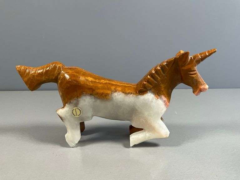 Charming vintage carved stone unicorn figurine, approximately 12 inches long and 6 inches tall, made from natural onyx and calcite. The piece features a beautiful blend of rich amber-brown and creamy white stone tones with a polished finish that highlights the natural veining. Retains its original “Forbidden Caverns, Tennessee” souvenir sticker, adding to its collectible appeal. A wonderful example of mid-century or later tourist folk art stone carving, this unique unicorn makes a whimsical addition to any mineral, souvenir, or mythical creature collection. Location: C