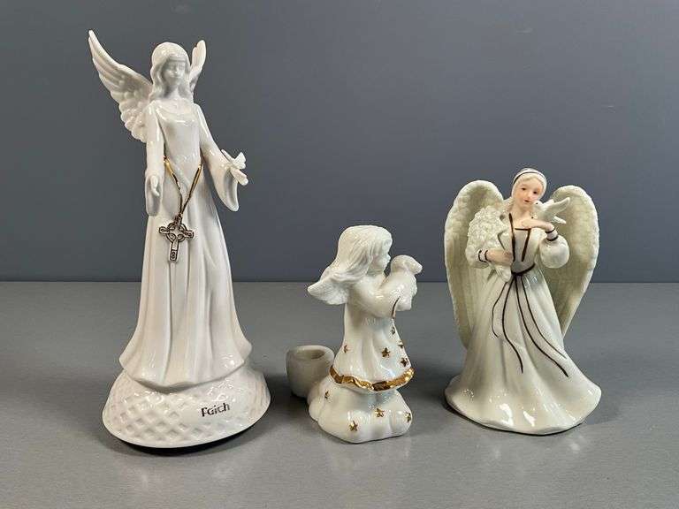 Beautiful lot of three porcelain angel figurines, including two working musical pieces. The tallest, titled “Faith”, stands approximately 10 inches tall and features a serene white finish with a gold-tone cross necklace. It plays a soft tune when wound. The second music box by Carlton Cards plays “Silent Night” and depicts a graceful angel holding a dove. The third piece is a small angel candle holder, accented with gold stars and trim, holding a lamb in her arms. All three are crafted with fine porcelain detail and a glossy glaze, perfect for collectors of religious décor or as inspirational holiday displays. Location: O2