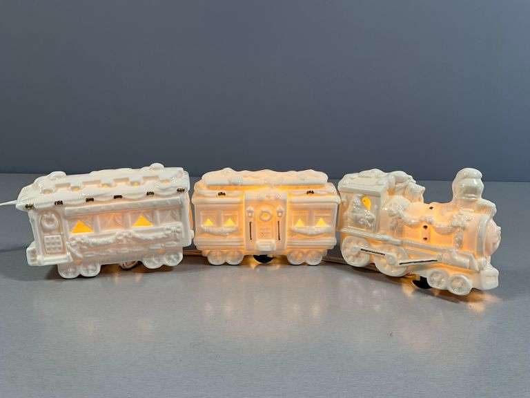 Beautiful lighted porcelain Christmas train set, consisting of three connected pieces — a locomotive, passenger car, and caboose — each adorned with raised snow and wreath detailing and trimmed in gold accents. The locomotive features Santa Claus in the cab, adding a festive holiday touch. When plugged in, the windows glow warmly, creating a cozy and cheerful Christmas display. Perfect for a mantel, tabletop, or under the tree, this porcelain train brings classic charm and elegance to your seasonal décor. Location: O5
