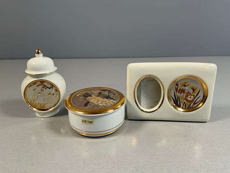 Elegant set of three Japanese porcelain pieces featuring the traditional Art of Chokin—an ancient Japanese metal engraving technique once used to adorn samurai armor. Each piece is decorated with intricate etched and gilded Chokin scenes finished in 24K gold and silver, including motifs of cranes, butterflies, and floral designs. The lot includes a covered jar, a round trinket box, and a rectangular double photo frame. All items are marked “Made in Japan” with original labels intact. Beautifully detailed with gold trim and rich luster, this collection makes a refined addition to any Asian art, porcelain, or Chokinware display. Location: O3