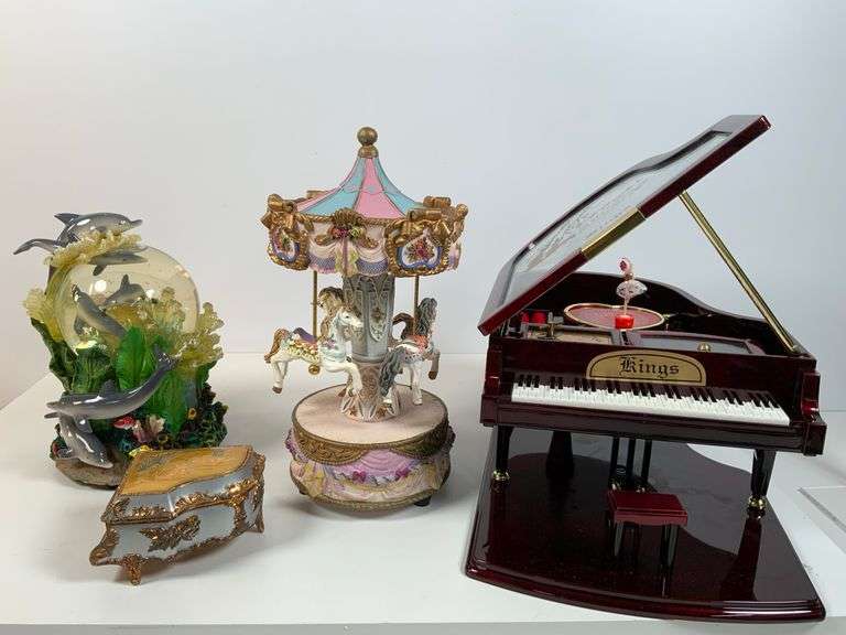 Musical figurines including: a carousel with horses, a dolphin-themed water globe, a piano marked “Kings” with ballerina, and a gold-accented piano-shaped trinket box featuring a swan motif. The piano has been personalized with a signature. The piano is made of a plastic material, the dolphin and carousel is a resin type material and trinket box is metal. Each item features intricate detailing and decorative charm. Location: Q