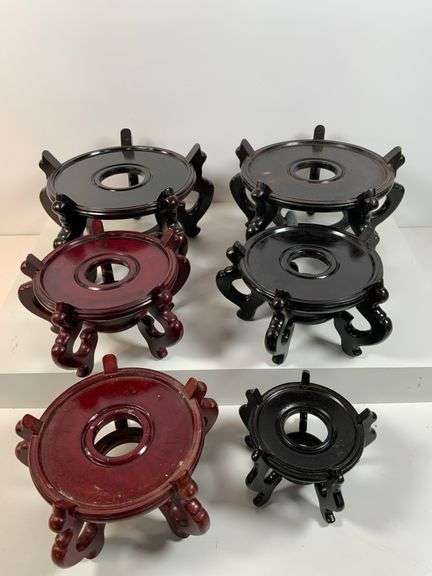 Set of six vintage-style wooden display stands in varying sizes and tones, including both deep red and black lacquer finishes. Ideal for displaying vases, figurines, or decorative bowls. Each stand features carved scroll legs and center opening design. Location: J Floor