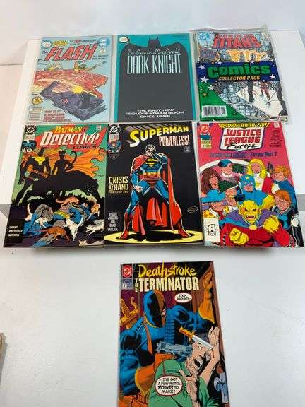 Mixed collection of vintage DC comics featuring popular heroes. Includes The Flash #300 (25th Anniversary issue), Batman: Legends of the Dark Knight #1, Detective Comics #612, Superman #72 “Powerless!”, Justice League Europe Annual #2 (Armageddon 2001), Tales of the Teen Titans, and Deathstroke the Terminator #2. Great lot for collectors of classic 1980s–1990s DC titles. Location: J