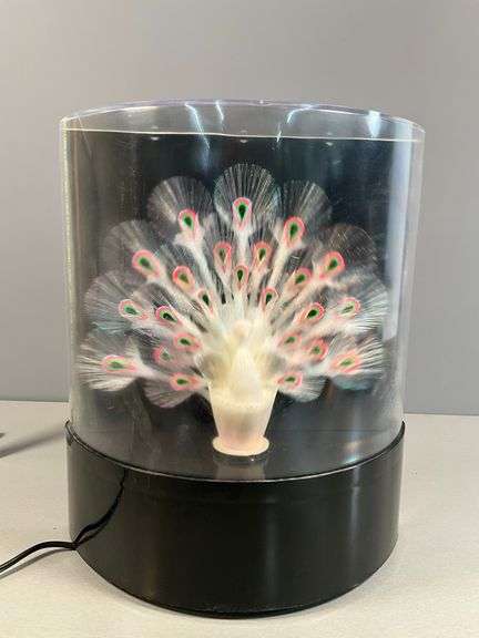 Striking vintage fiber optic peacock lamp, featuring a white peacock figure with a fully fanned tail that glows in a mesmerizing rotation of multi-color lights. Encased in a clear Plastic cylindrical cover with a black base, this classic decorative light brings retro charm and ambient color to any space. Operates via corded power and displays beautifully when lit.