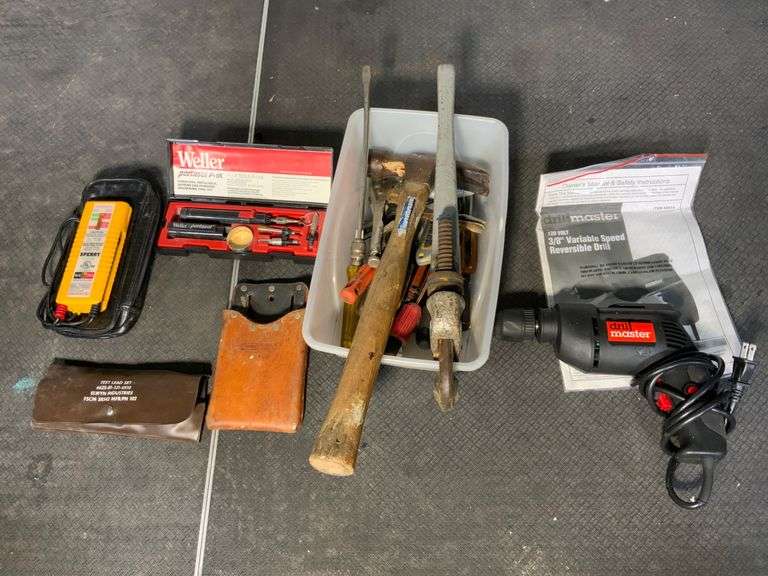 Lot includes: Drill Master 3/8 inch variable speed reversible drill (tested and working), its manual, and safety instructions; a Weller Portasol P-1K cordless butane soldering kit in case; a Sperry Voltector model V-11A voltage tester; Elwyn Industries test lead set in pouch; assorted hand tools including hammers, pliers, screwdrivers, and a large pipe wrench. Small Tools have not been tested. Location: Gallery