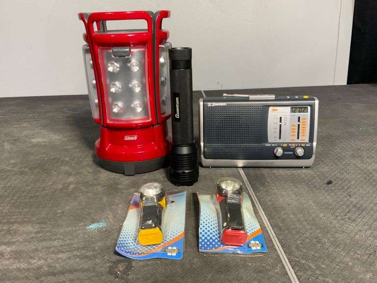 Emergency supplies lot including a red Coleman lantern with multiple LED sections, a Quantum flashlight, an Emerson multi-band portable radio with AM/FM functions, and two packaged small flashlights (in yellow and red). The lot provides essential lighting and communication tools for emergency preparedness. Location: Gallery