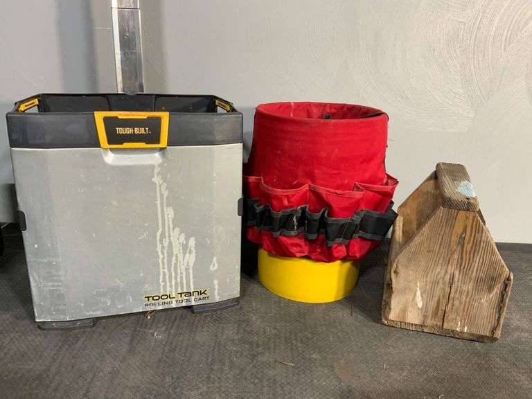 A ToughBuilt Tool Tank rolling tote cart with wheels, one red fabric organizer bag with multiple exterior pockets and a yellow plastic base, and one rustic wooden crate featuring an open compartment design. Location: Gallery
